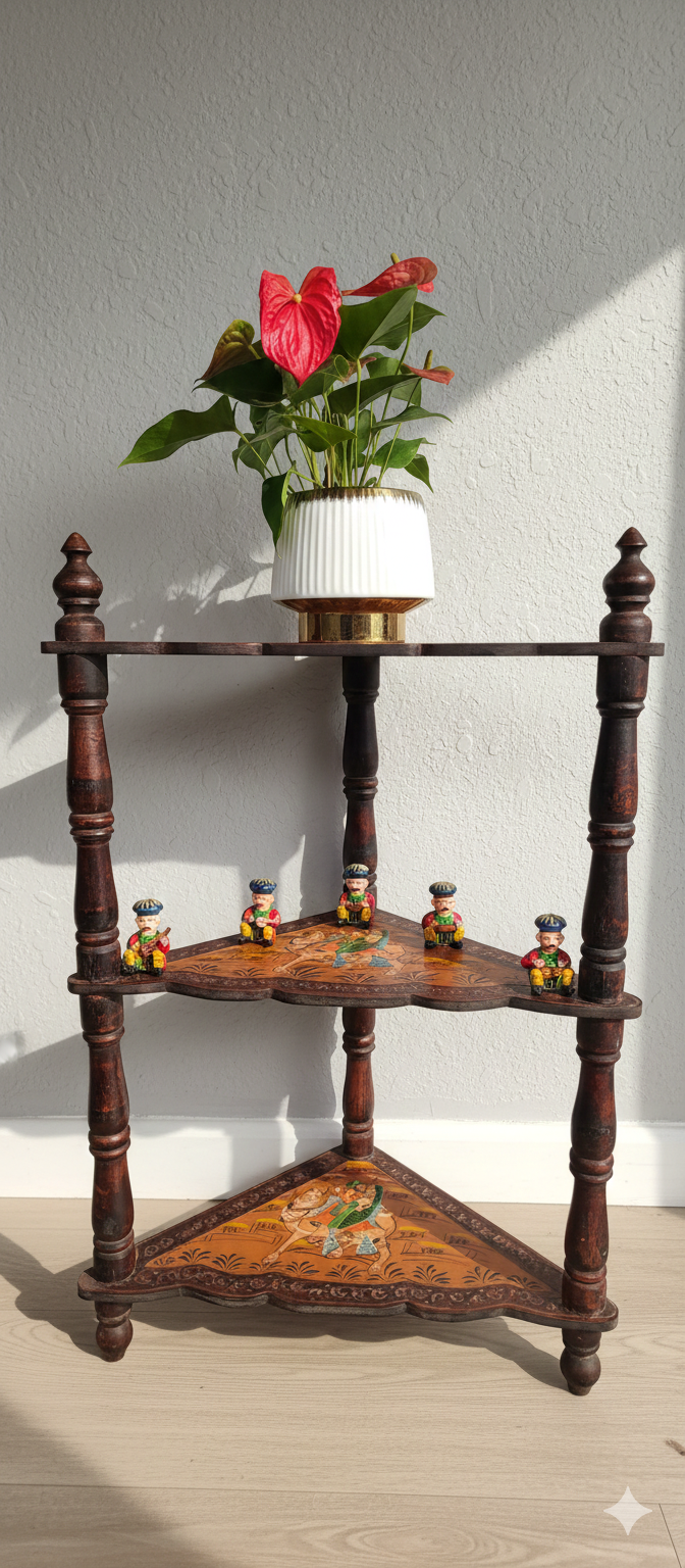 This Corner Stand transforms the most overlooked space in any room — the empty corner — into a showcase of Rajasthani folk art. Three tiers of solid wood are hand-painted by artists in Udaipur with vibrant scenes from village life: camel processions, desert landscapes, and geometric patterns drawn from traditional textile motifs.
