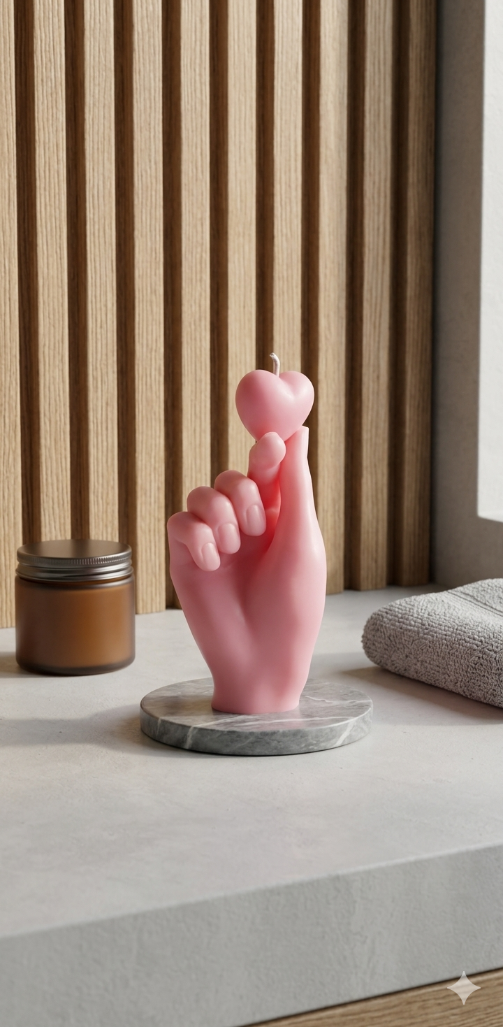 The Pink Promise Hand Candle is a statement piece that blends art and emotion. Sculpted in the shape of a graceful hand holding a tiny heart, it captures the feeling of affection, care, and quiet luxury in one minimalist design. Placed on its sleek round base, it instantly elevates your side table, vanity, or bathroom shelf and pairs beautifully with jars, towels, and other spa-inspired accessories. Whether you keep it as an art object or light it for a special moment, this candle is made to be photographed, gifted, and remembered.