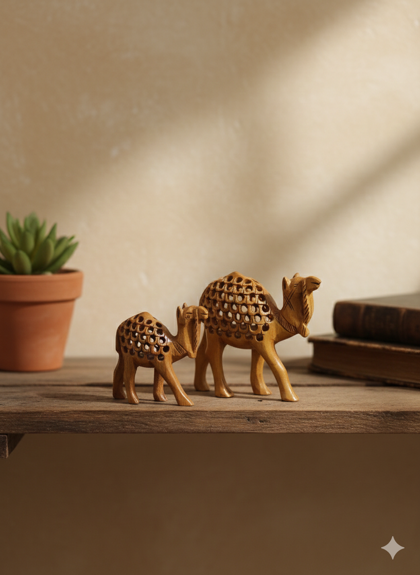 Traverse the sands in miniature with Desert Grace Duo: a mother camel and her calf, masterfully carved with openwork lattice revealing fine grain, capturing Thar Desert poise. Ideal heritage accent for boho homes, offices, or as meaningful gifts evoking resilience and companionship.