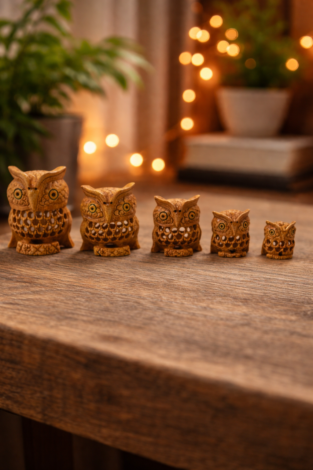 Discover the magic of Kadamb wood – prized by artisans for its light, fine grain that enables intricate lattice carving. This set of 5 hand‑carved Kadamb wood owls features a hidden baby owl inside each adult visible through delicate jali cutwork, creating a delightful surprise. The warm wood tone and subtle detailing catch ambient light beautifully for Diwali, Christmas, or year‑round décor. Choose the complete set for maximum impact, or buy individual owls for desks, puja corners, or corporate gifts. Sustainable Kadamb wood brings wisdom, protection, and artisan storytelling to every space.