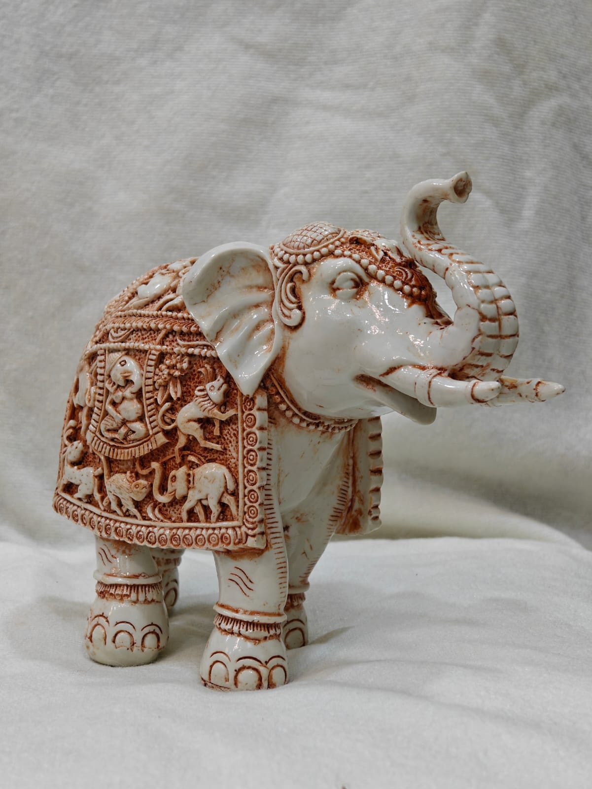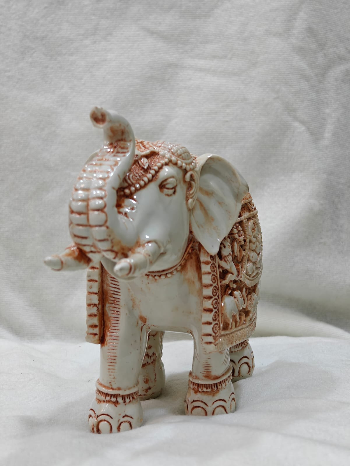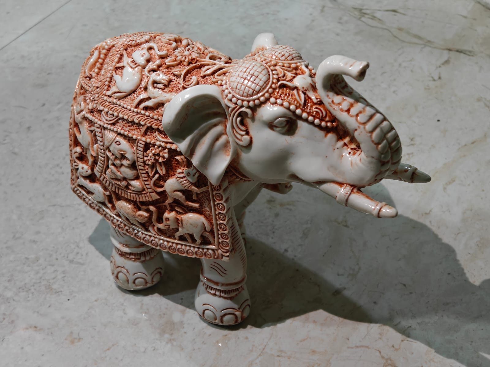 This sculpture’s white-and-copper color palette complements many decor styles. The marble carving makes it ideal as a centerpiece during festivals or as a wedding, housewarming, or business gift. People appreciate the marble elephant for its symbolism of perseverance, loyalty, and prosperity.