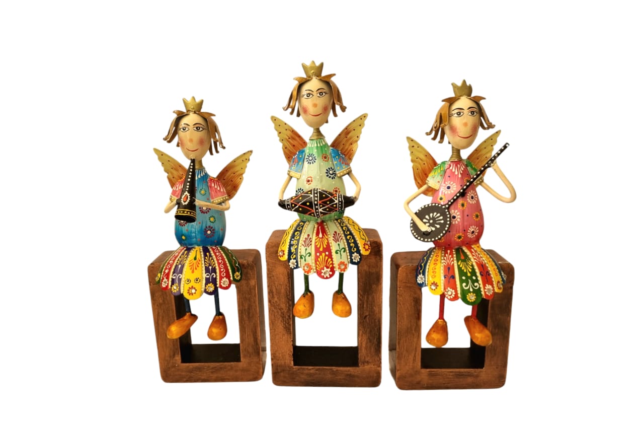 Brighten your room with this delightful set of angel fairy figurines. Each piece is handcrafted from metal and painted in vibrant colors, adding a playful magic to any shelf, table, or showcase. Their music-themed instruments—flute, banjo, and dholak—tell a story of joyful celebration, with delicate wings and golden shoes enhancing the whimsical look.
