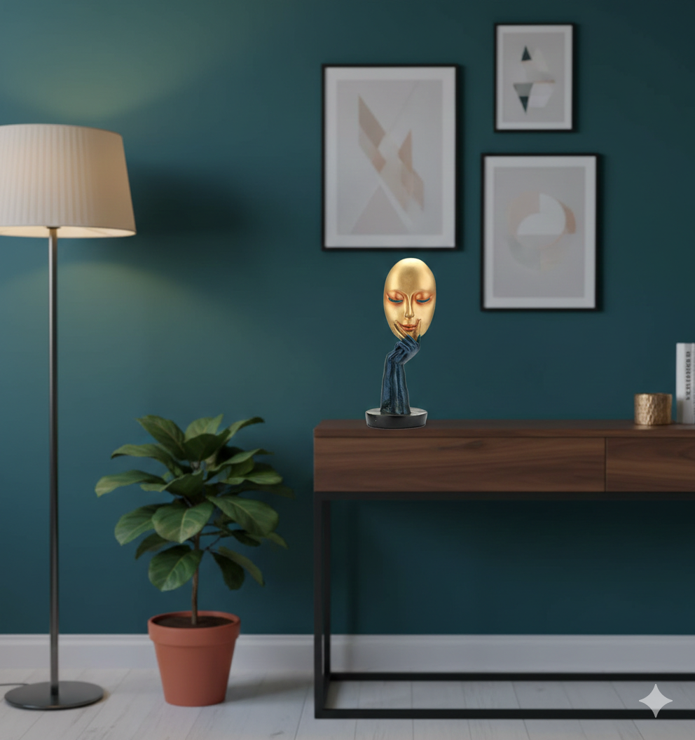 Delve into duality with Between Thoughts: a bold golden bust blending human face and mask, capturing the space between realities. Crafted in polished resin for dramatic effect, it suits contemporary galleries, studies, or as intriguing décor sparking conversations on perception and self.