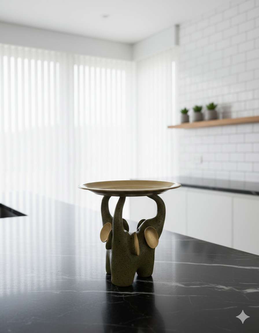 Transform everyday moments with this handcrafted brass Elephant Trunk Tray, where two majestic elephant heads with curved trunks elegantly support a round serving plate. The antique-finish brass gleams with royal motifs, blending utility and artistry for kitchens, vanities, or coffee tables. A timeless piece from Rajasthan’s metalworkers for hosting or gifting.