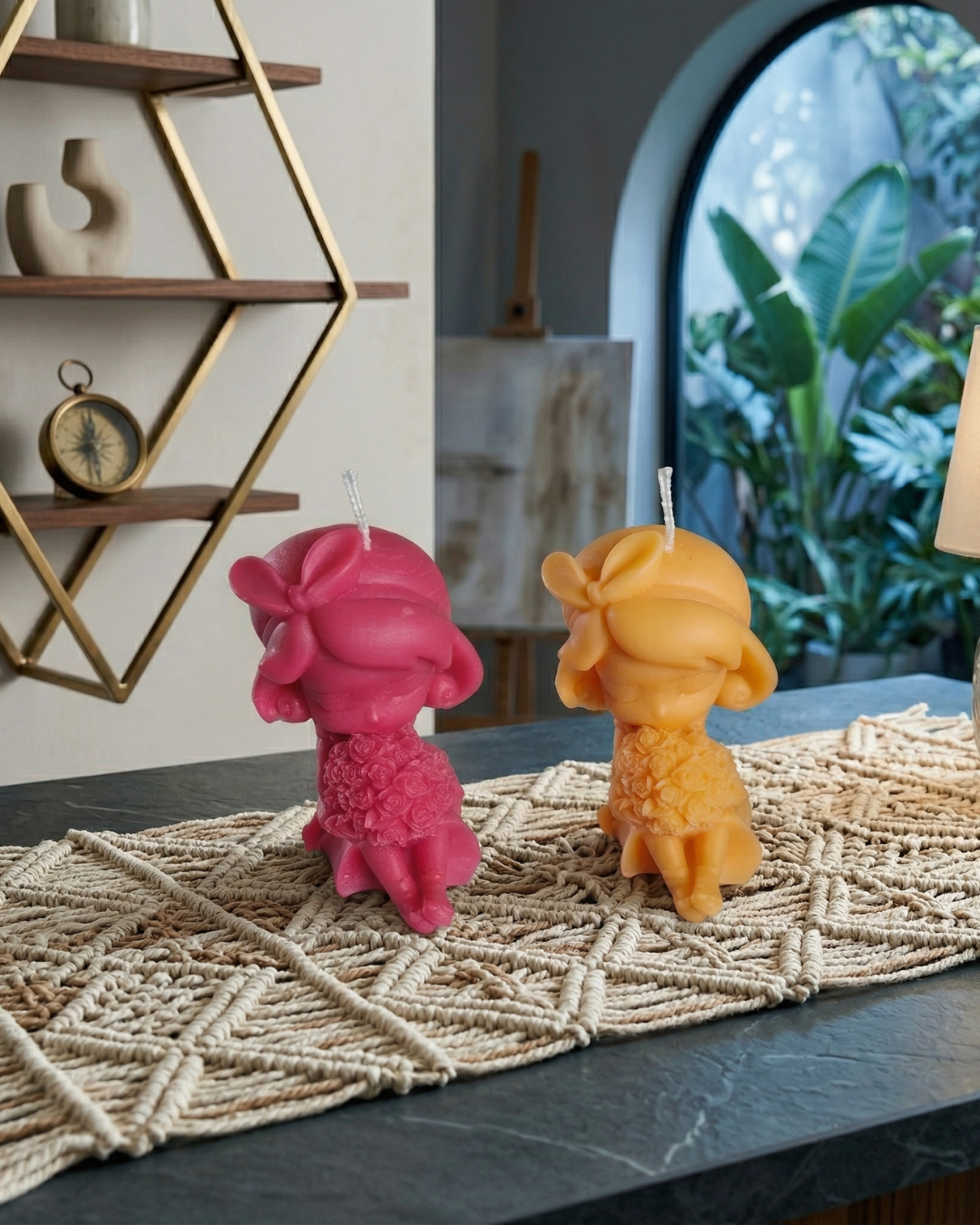 • Sculpted girl candles in rose pink and marigold yellow.