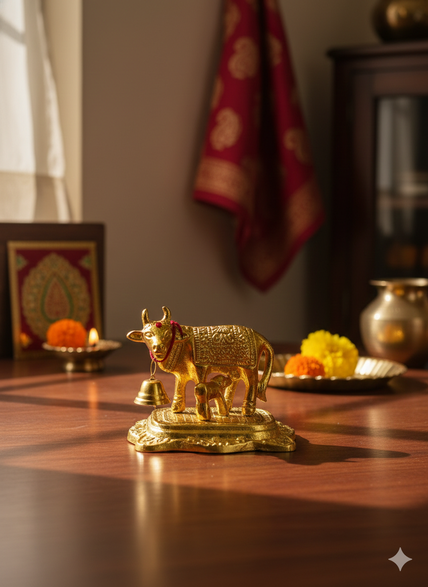 Invite divine prosperity with this handcrafted golden brass Kamdhenu statue, depicting the mythical wish-fulfilling cow and her calf in serene poise on an ornate pedestal. Polished to a radiant shine, it embodies Vedic blessings for wealth and harmony—ideal for devotional spaces, festive tables, or as auspicious housewarming gifts.