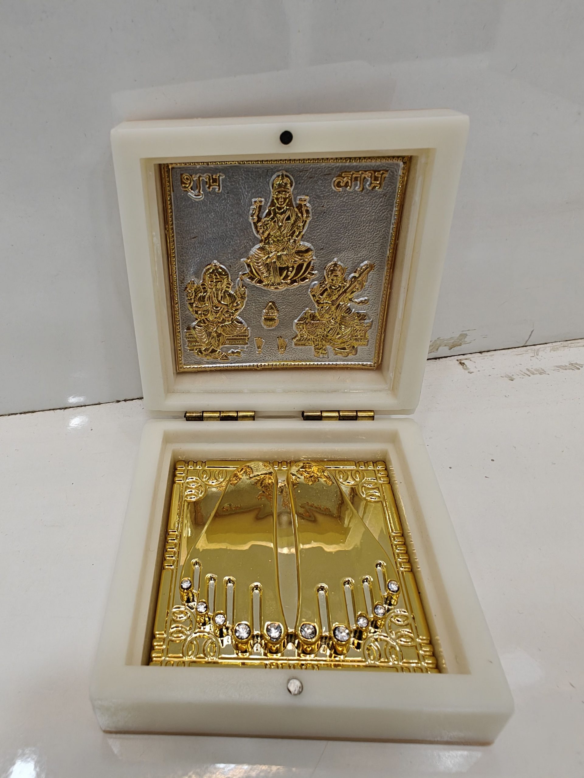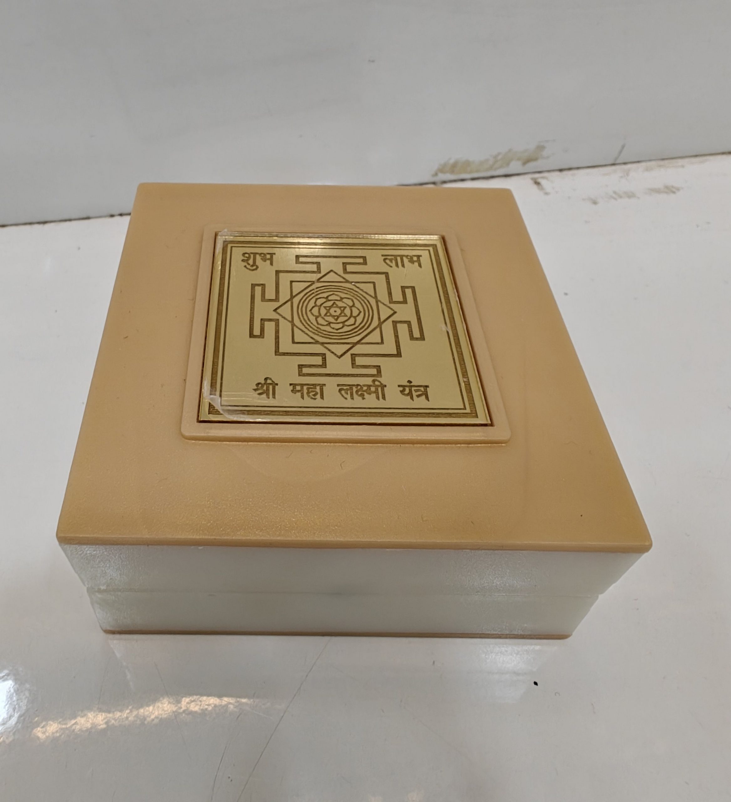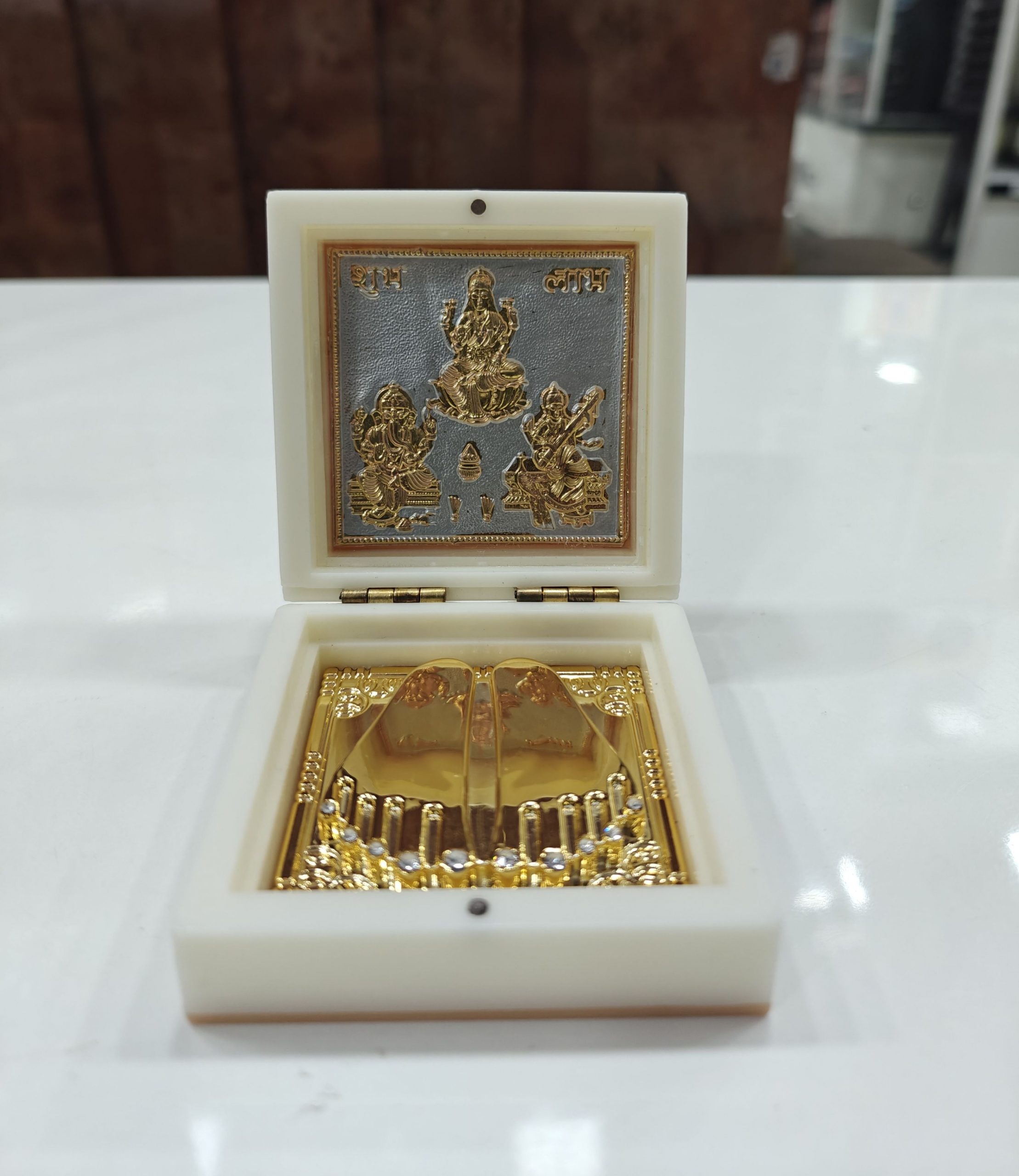The yantra is crafted on a gleaming golden plate within a smooth marble box. The lid features embossed images of Goddess Lakshmi, Saraswati, and Ganesha, blending spirituality with craftsmanship. This compact box protects the yantra and makes it easy to display or carry.